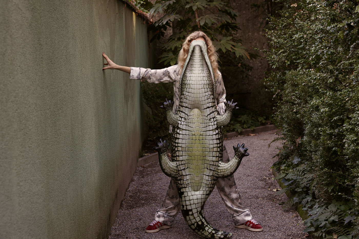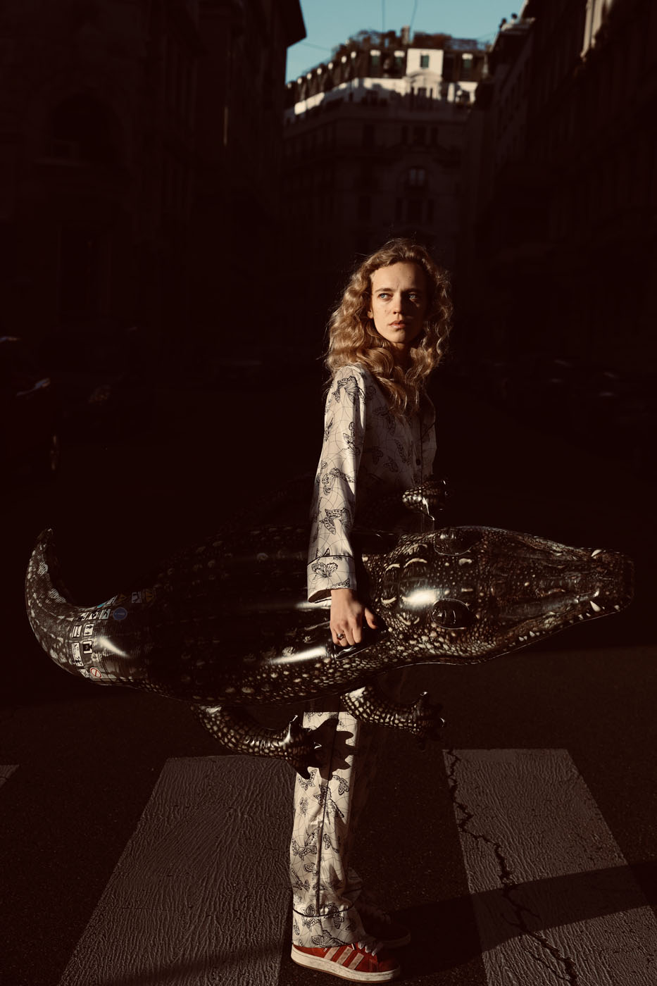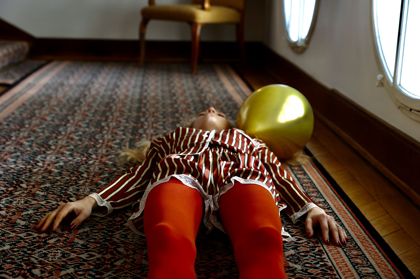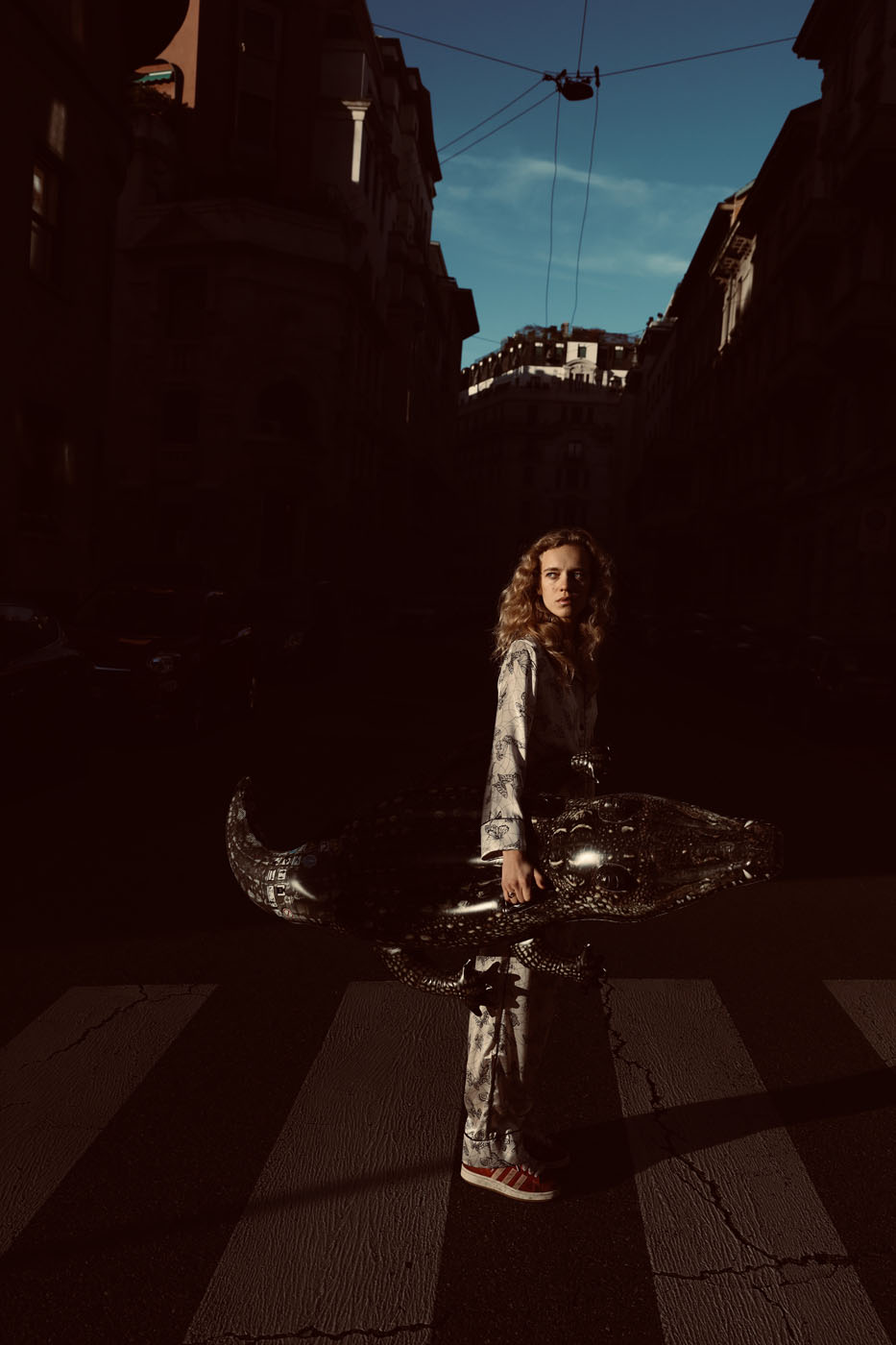 Alexandra Adami’s photography is distinguished by her artful and unpredictable incorporation of whimsical elements. These items, though seemingly disparate, are masterfully used to add layers of depth and intrigue to her compositions. Golden balloons float with a carefree elegance, their reflective surfaces catching light and drawing the eye, sometimes concealing, sometimes accentuating, but always enhancing the mystique. A silver crocodile introduces an element of the surreal, its metallic sheen and unexpected presence in the scenes creates a striking visual metaphor that challenges and delights the viewer. A humble pillowcase, often overlooked in everyday life, is transformed under Adami’s lens into a symbol of comfort and creativity, its fabric and folds contributing to the narrative of each image. Together, these elements showcase Adami’s unique ability to blend the ordinary with the fantastical, inviting viewers into a world where the familiar becomes extraordinary, and the mundane is reimagined as magical.
