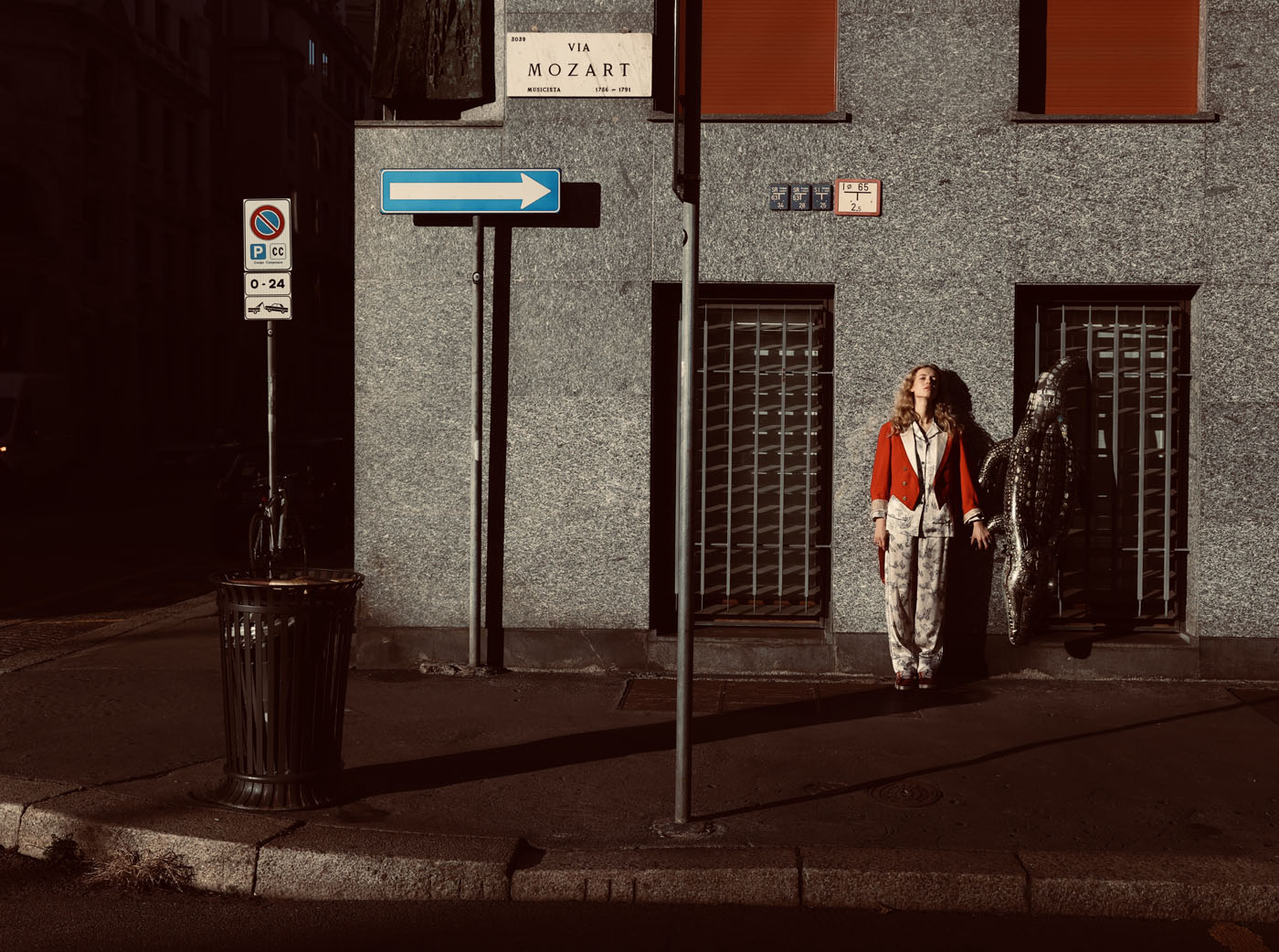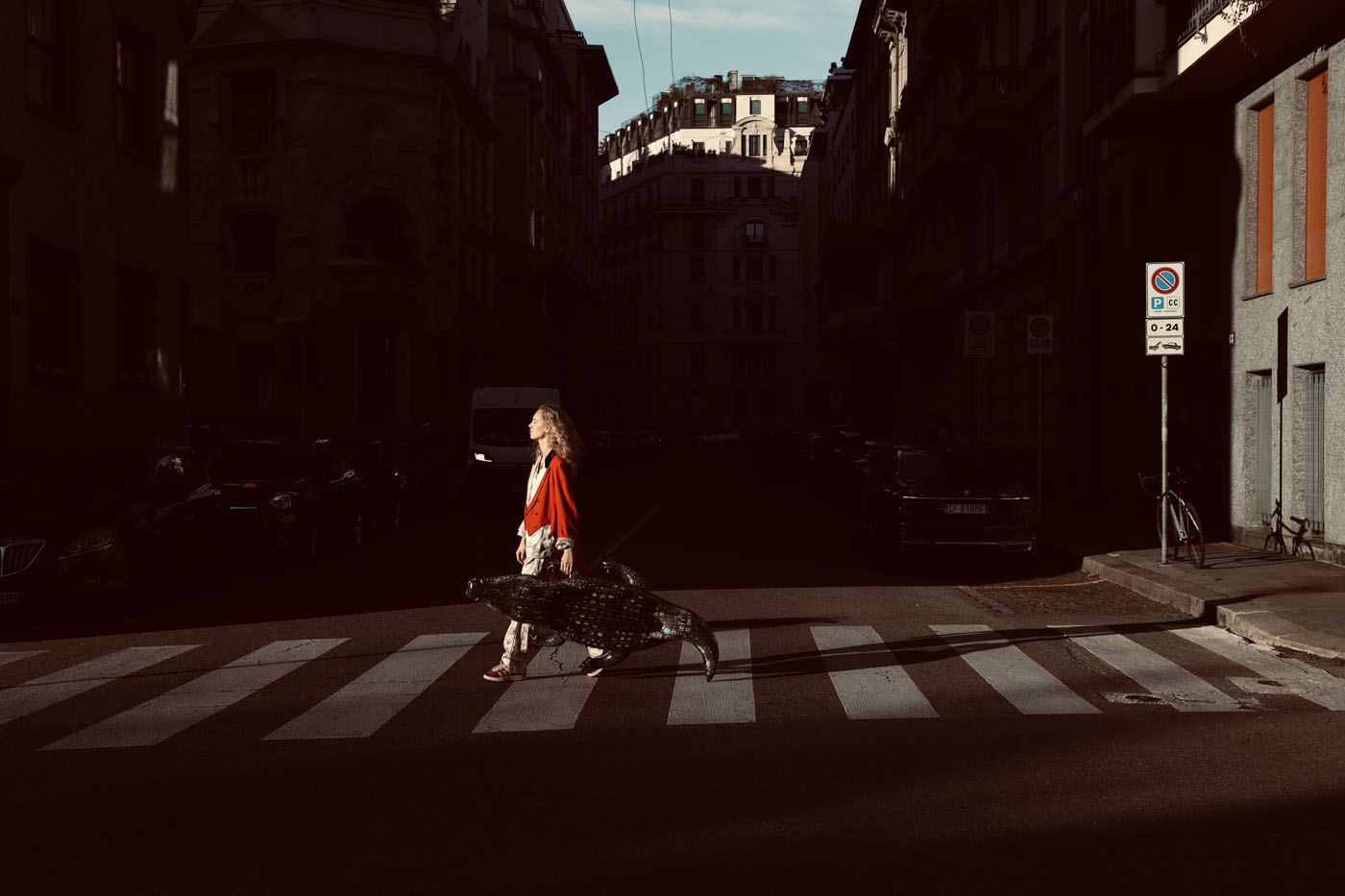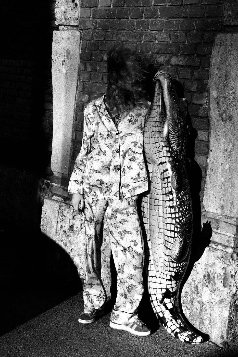 Alexandra Adami’s photography is distinguished by her artful and unpredictable incorporation of whimsical elements. These items, though seemingly disparate, are masterfully used to add layers of depth and intrigue to her compositions. Golden balloons float with a carefree elegance, their reflective surfaces catching light and drawing the eye, sometimes concealing, sometimes accentuating, but always enhancing the mystique. A silver crocodile introduces an element of the surreal, its metallic sheen and unexpected presence in the scenes creates a striking visual metaphor that challenges and delights the viewer. A humble pillowcase, often overlooked in everyday life, is transformed under Adami’s lens into a symbol of comfort and creativity, its fabric and folds contributing to the narrative of each image. Together, these elements showcase Adami’s unique ability to blend the ordinary with the fantastical, inviting viewers into a world where the familiar becomes extraordinary, and the mundane is reimagined as magical.