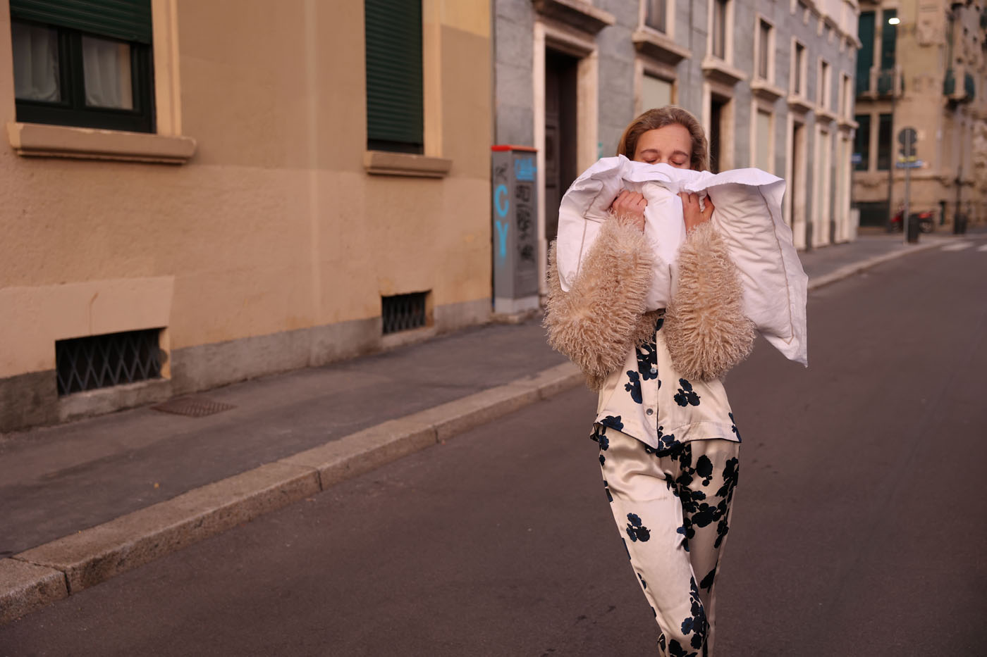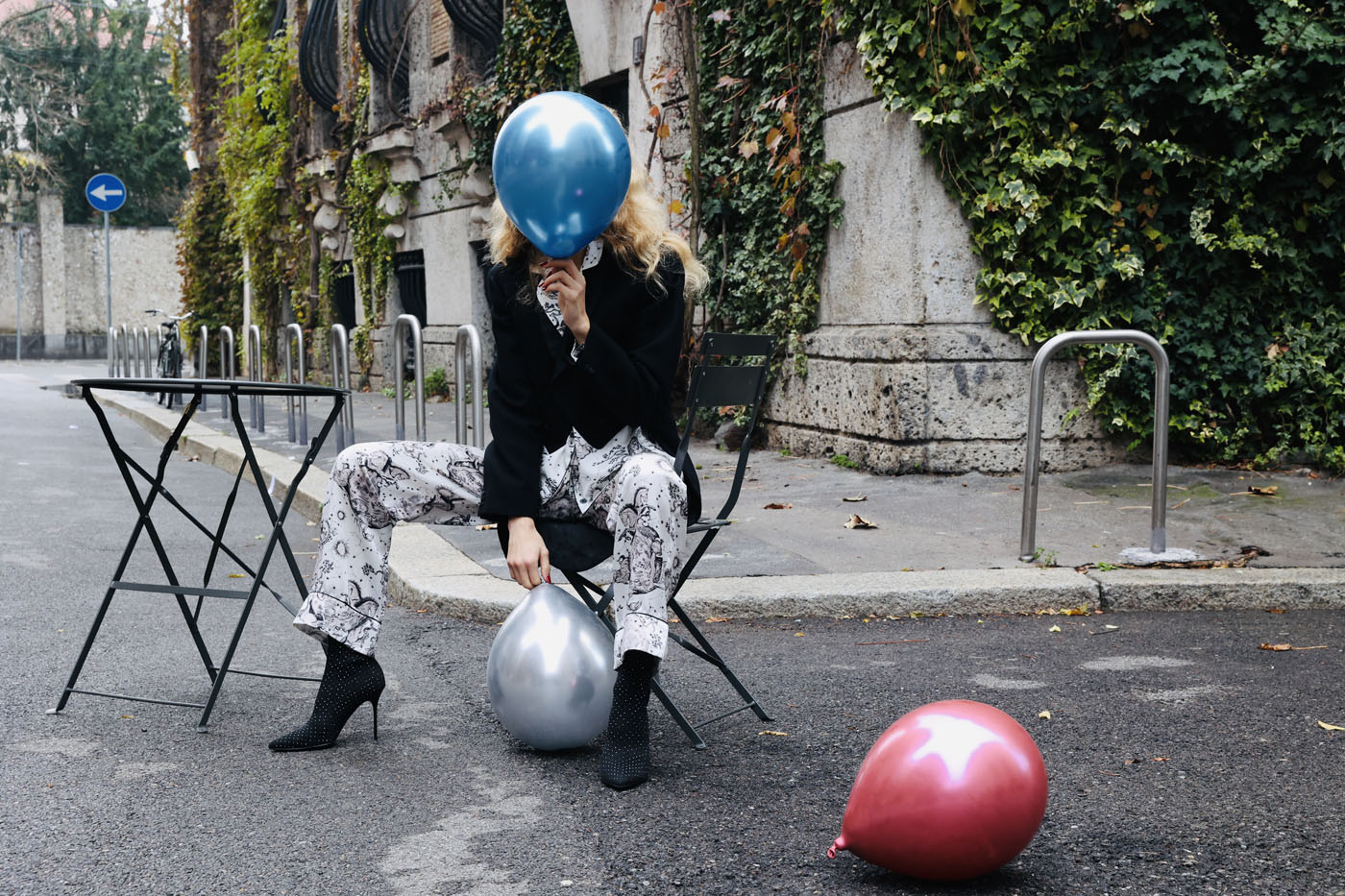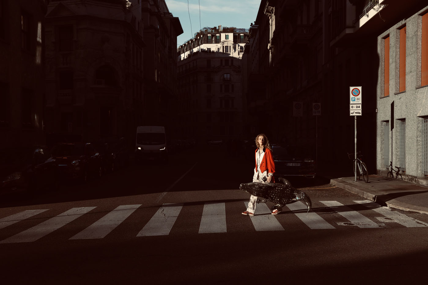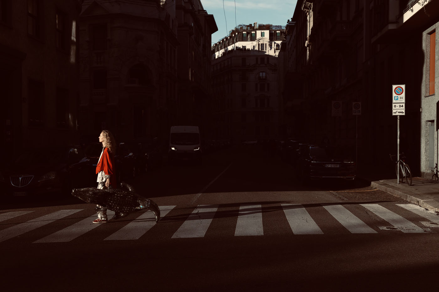 Alexandra Adami’s photography is distinguished by her artful and unpredictable incorporation of whimsical elements. These items, though seemingly disparate, are masterfully used to add layers of depth and intrigue to her compositions. Golden balloons float with a carefree elegance, their reflective surfaces catching light and drawing the eye, sometimes concealing, sometimes accentuating, but always enhancing the mystique. A silver crocodile introduces an element of the surreal, its metallic sheen and unexpected presence in the scenes creates a striking visual metaphor that challenges and delights the viewer. A humble pillowcase, often overlooked in everyday life, is transformed under Adami’s lens into a symbol of comfort and creativity, its fabric and folds contributing to the narrative of each image. Together, these elements showcase Adami’s unique ability to blend the ordinary with the fantastical, inviting viewers into a world where the familiar becomes extraordinary, and the mundane is reimagined as magical.
